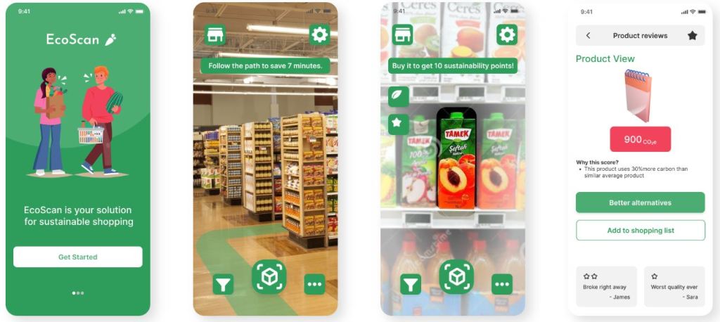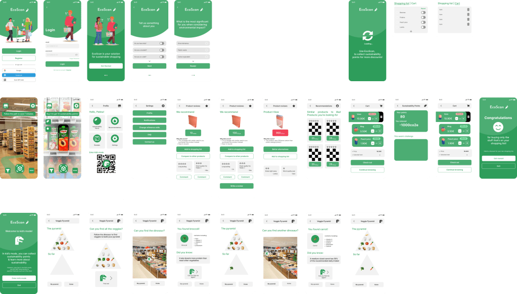The objective of this project was to utilize extended reality (XR) to guide people towards more sustainable practices. Specifically, the focus was on enhancing eco-friendliness to users through digital technology aimed at uplifting the shopping experience while promoting sustainability options and fostering an optimal path for the shopper to avoid overconsumption. Throughout this project, employed design techniques & methodologies were CUE-model alongside with Experience-Driven design approach. The end product EcoScan, is an app that’s goal is to help customers gain more awareness of carbon dioxide emissions with their shopping habits and learn more sustainable ways to consume. Its main feature is the optimal shopping path visualized in AR. This digital prototype is built in Figma.