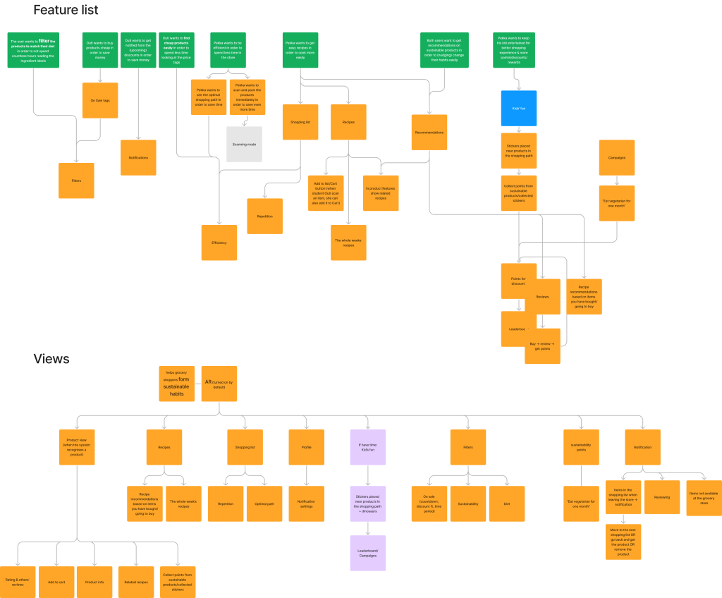The graph below shows the ideation and brainstorming results of the first starting point. To find justification for the design decisions, a literature research was conducted by reviewing eight related papers and benchmarked existing solutions, of which the most papers were Nudging more sustainable grocery purchases: Behavioural innovations in a supermarket setting and PHARA: an augmented reality grocery store assistant.