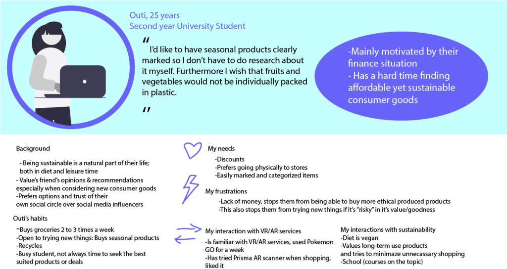 - Based on the all aforementioned research, two user personas were built. The first one, Outi, is a typical university student with a low budget to spend on groceries. The second one, Pekka, is a parent of two kids working as an engineer. From Pekka, it was found having kids had a strong influence on grocery shopping habits, while from Outi, it was learned personal finance impacts with certain limits what choices users can make when considering choosing sustainable options when it comes to refreshments.